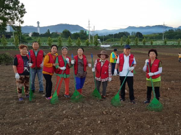 (사)경기 연천군자원봉사센터는 지난 17일 오전 5시 16개 단체 자원봉사자회원 150여명이 참석한 가운데 ‘2018 가을에 찾아온 눈꽃송이축제’를 위한 메밀꽃 군락지 부지 정리작업을 진행했다. 사진은 부지 정리에 참여한 관계자들이 기념촬영을 하는 모습. (사진제공=연천군청)