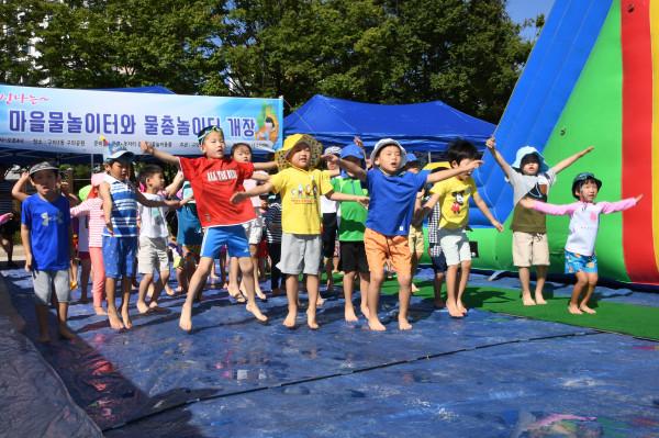 서울 광진구 구의3동 주민들이 마을총회를 통해 선정한 의제 중 첫 번째 실천사업인 ‘물놀이터’가 지난 17일 오전 10시~오후 4시 6시간 동안 구의공원에서 개장했다. 사진은 ‘물놀이터’에 참여한 어린이들이 물놀이를 하기 전에 준비운동을 하고 있는 모습. (사진제공=광진구청)