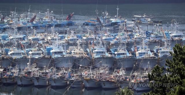 태풍 '솔릭'이 북상 중인 21일 오후 제주 서귀포에 어선들이 대피해 있다.