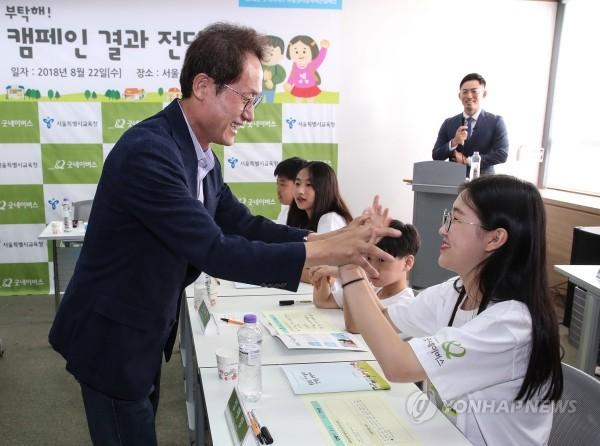 조희연 서울시 교육감이 22일 오전 서울시 종로구 서울시 교육청에서 열린 국제구호개발 NGO 굿네이버스 아동권리정책제안 캠페인 '똑똑똑, 우리동네 아이들의 정책을 부탁해' 결과 전달식에 입장한 뒤 참석 학생들과 하이파이브를 하고 있다.
