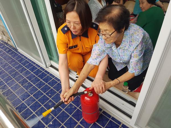 서울 영등포소방서는 21일 대림동에 위치한 행복경로당에서 '찾아가는 소방안전교육'을 실시했다. 교육내용은 노인 눈높이에 맞춘 화재 발생시 119 신고 요령, 소화기 사용법, 심폐소생술과 생활 응급처치 등이다. 사진은 소방관이 노인에게 소화기 사용방법에 대해 설명하고 있는 모습. (사진제공=영등포소방서)