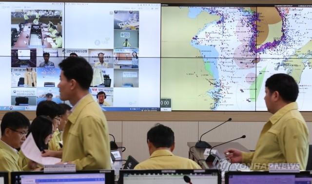 한반도가 제19호 태풍 '솔릭'의 영향권에 든 22일 오후 정부세종청사 해양수산부 '태풍피해 비상대책 상황실'에서 직원들이 비상근무를 서고 있다.