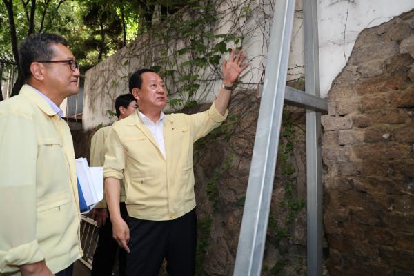 22일 오후 유동균 서울 마포구청장이 제19호 태풍 솔릭을 대비해 지역내 옹벽 및 연약지반 등 붕괴위험이 있는 곳을 찾아 위해요소가 있는지 확인하고 있다. 이날 유 구청장은 기상악화에 따른 피해가 발생하지 않도록 옹벽 등을 확인하고 옥외광고물 등 강풍과 폭우에 취약한 시설들을 집중적으로 점검했다. (사진제공=마포구청)