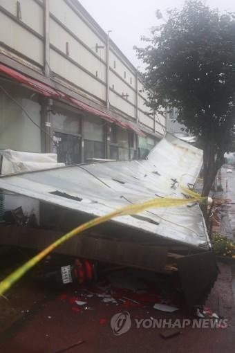 제19호 태풍 솔릭이 제주도를 관통한 23일 오전 제주 서귀포시 서귀동의 한 마트에 설치된 대형간판이 강풍에 떨어져 있다.