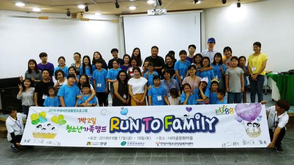 최근 경기 안성시 청소년상담복지센터는 1박2일 일정으로 보개면에 위치한 너리굴문화마을에서 청소년가족캠프인 ‘런 투 패밀리(Run To Family)’를 진행했다. 사진은 런 투 패밀리에 참석한 청소년 등 관계자들이 기념촬영을 하는 모습.(사진제공=안성시청)