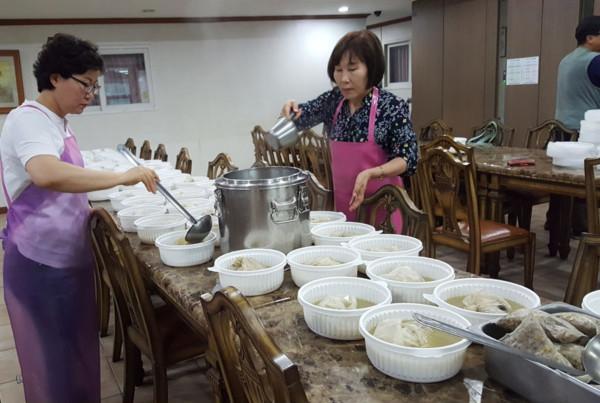 성복임·신금자·이우천 경기 군포시의원은 최근 성민재가노인복지센터에서 삼계탕 140인분을 직접 만들어 지역내 홀몸노인들에게 전달하는 행사를 진행했다. 사진은 성 의원(왼쪽)과 신 의원(오른쪽)이 삼계탕을 담고 있는 모습. (사진제공=군포시의회)