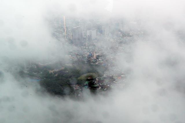 전국 대부분 지역이 흐리고 비가 내리는 27일 오전 남산서울타워 주변에 안개가 자욱하다.