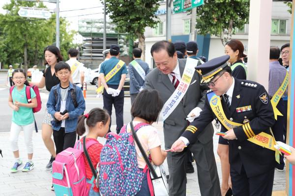 유동균 서울 마포구청장이 28일 성산동 소재 중동초등학교 정문 앞에서 교통안전 캠페인을 펼쳤다. 사진은 유 구청장이 이종규 마포경찰서장과 함께 학생들에게 예방수칙이 담긴 홍보물을 나눠주고 있는 모습. (사진제공=마포경찰서)