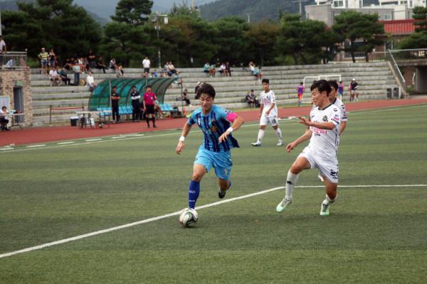 경기 양평군 소속인 양평FC는 지난 25일 용문생활체육공원에서 열린 ‘2018 K3리그 어드밴스트 17라운드’ 전북 전주시민구단과의 홈경기에서 2대0으로 완승을 거두고 7위로 올라섰다. 사진은 양평FC와 전주시민구단이 경기를 진행하고 있는 모습. (사진제공=양평군청)