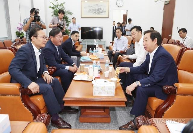 28일 오전 국회 본청 운영위원회 위원장실에서 현안 논의를 위해 3당 여야 원내대표가 간단한 조식을 겸하며 회동하고 있다. 왼쪽부터 시계방향으로 더불어민주당 홍영표 원내대표, 김태년 정책위의장, 바른미래당 채이배 정책위의장 권한대행, 자유한국당 함진규 정책위의장, 바른미래당 김관영 원내대표, 자유한국당 김성태 원내대표.