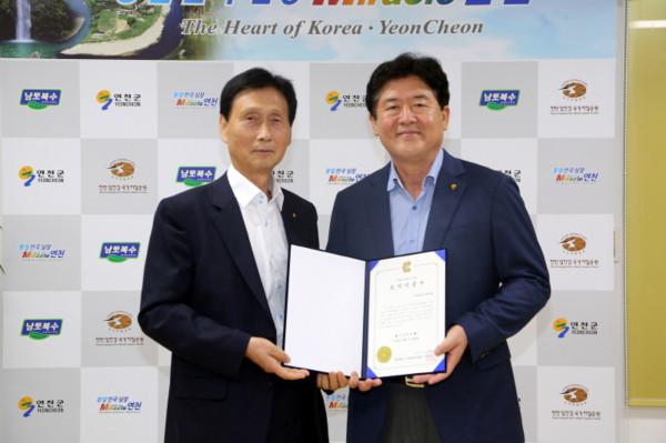 (사)무궁화복지월드가 경기 연천군 지역내 노인들을 위해 ‘노년! 나는 당당하게 살고 싶다’ 등의 문화·역사·철학 관련 도서 368권을 군에 기탁했다. 사진은 김광철 군수(오른쪽)가 무궁화복지월드 관계자와 기탁서를 들고 기념촬영하는 모습. (사진제공=연천군청)