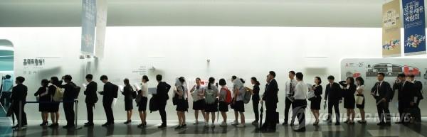 29일 오전 서울 동대문디자인플라자에서 열린 금융권 공동 채용박람회에서 참석자들이 각 기업 부스를 둘러보고 있다.