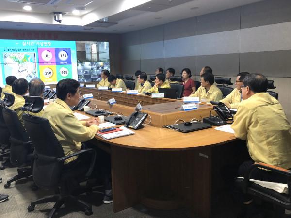 조광한 경기 남양주시장은 28일 '호우경보'가 발효됨에 따라 이날 오후 10시 부시장과 행정안전실장을 비롯한 간부공무원을 긴급 소집해 대책회의를 개최했다. 사진은 조 시장을 비롯한 대책회의에 참석한 간부들이 회의를 이어가고 있는 모습. (사진제공=남양주시청)