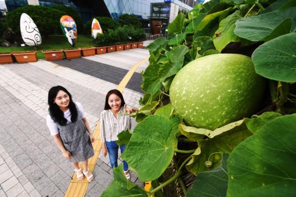 용산구가 자연을 느끼기 어려운 도시민들에게 작은 쉼터 역할을 해줄 수 있도록 구청사 앞에 조성한 '용산마을농원' 원두막에 최근 큼지막한 박이 열렸다. 사진은 '대박'을 보며 즐거워하는 시민들의 모습. (사진제공=용산구청)