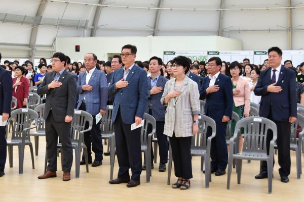 30일 서울 강남구의회의원들이 일원동 일원에코파크내 에코센터에서 개최된 ‘2018 친환경 페스티벌’에 참석했다. 사진은 페스티벌에 참석항 참석한 강남구의회 의원들이 국민의례를 하고 있는 모습. (사진제공=강남구의회)
