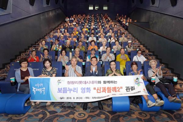 최근 서울 동대문구지역사회보장협의체가 청량리롯데시네마에서 지역내 저소득층 노인을 대상으로 ‘행복한 보듬누리 영화관람’ 행사를 개최했다. 사진은 유덕열 구청장(앞줄 가운데)이 <신과 함께2>를 관람한 후 기념촬영을 하고 있는 모습. (사진제공=동대문구청)