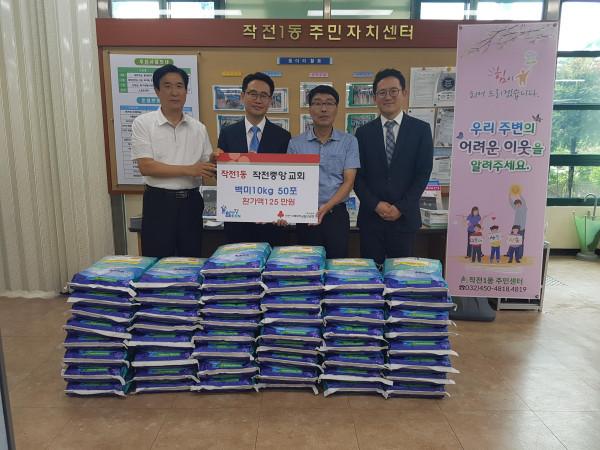 최근 인천 계양구 ‘작전중앙교회’는 추석을 맞아 작전1동 행정복지센터에 백미 10kg 50포(환가액 125만원)와 생필품 14세트(환가액 60만원)를 기탁했다. 사진은 관계자들이 기념촬영을 하는 모습. (사진제공=계양구청)