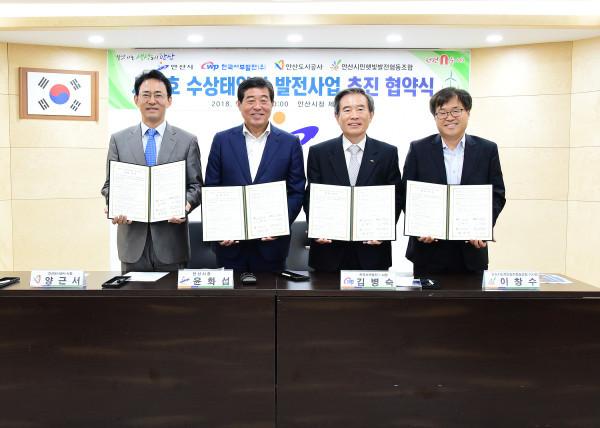 | ▲ 안산시, 한국서부발전, 안산도시공사, 안산시민햇빛발전협동조합 관계자들이 ‘시화호 수상태양광 발전사업’ 업무협약을 체결하고 기념촬영을 하고 있다. (사진제공=안산시청) | ||
