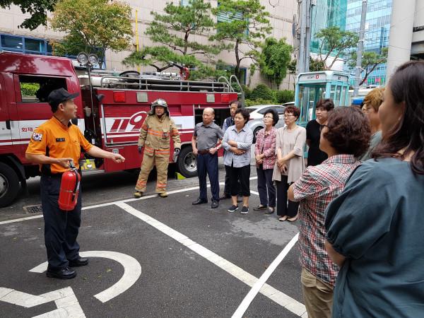 최근 서울 성동구 용답동은 왕십리119안전센터와 함께 용답동 주민센터 주차장 일원에서 ‘소방관서 합동소방훈련’을 실시했다. 사진은 합동소방훈련에 참가한 참석자들이 소방관으로부터 소화기 사용법을 배우고 있는 모습. (사진제공=성동구청)