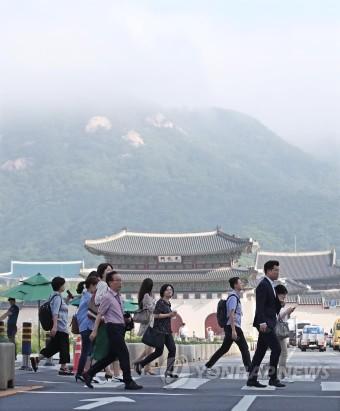 아침 기온이 선선한 날씨를 보이는 4일 오전 서울 종로구 광화문광장에서 출근길 시민들이 발걸음을 옮기고 있다.