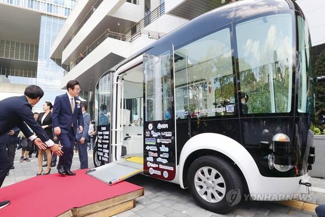 이재명 경기도지사가 4일 오전 경기도 성남시 판교 제2테크노벨리 기업지원허브 앞에서 열린 ‘제로셔틀 시범운행 시승행사’에 참석, 자율주행차 ‘제로셔틀’을 시승하고 있다.