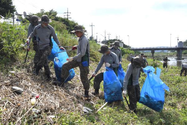 경기 동두천시는 지난 집중호우로 신천에 발생한 수해쓰레기와 퇴적물로 시민의 불편이 없도록 오는 7일까지 국군장병들과 협조해 복구작업을 실시한다. 사진은 4일 28사단 포병연대 소속 장병들이 신천변 수해쓰레기를 수거하고 있는 모습. (사진제공=동두천시청)