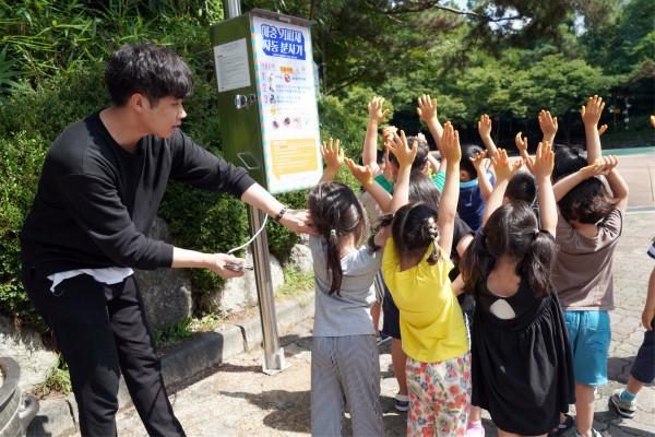 | ▲ 배봉산체험학습장을 찾은 어린이들의 안전을 위해 해충기피제 자동분사기를 사용하고 있다. (사진제공=동대문구청) | ||