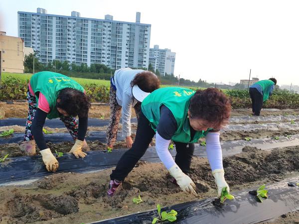 경기 오산시 세마동 새마을지도자협의회와 새마을부녀회는 지난 1일 세마동 지역내 휴경지 밭에 이웃돕기를 위한 ‘사랑의 배추’를 파종하는 행사를 진행했다. 사진은 참가자들이 배추를 파종하고 있는 모습. (사진제공=오산시청)