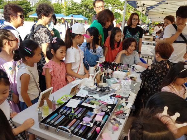 경기 수원시 권선구 금곡동은 최근 칠보중학교 운동장에서 주민 500여명이 참여한 가운데 제2회 칠보 생태마을 축제를 개최했다. 사진은 이날 축제에서 네일아트 체험부스를 찾은 주민들의 모습. (사진제공=권선구청)