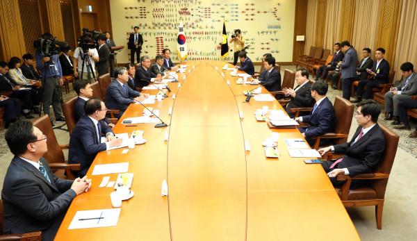문희상 국회의장은 4일 오후 4시 국회의장 접견실에서 전국시·도의회의장협의회에 소속된 8개 시·도의회 의장들과 함께 지방의회 현안에 대한 국회 협조와 관련된 간담회를 개최했다. 사진은 문 의장과 협의회장인 송한준 경기도의장 등 관계자들이 의견을 나누는 모습. (사진제공=국회 공보실)