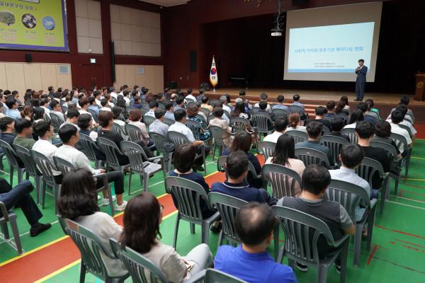 최근 서울 동대문구가 ‘사회적 가치와 공공기관 패러다임의 변화’라는 주제로 구청 다목적 강당에서 전직원을 대상으로 사회혁신 전문가 초청 특강을 진행했다. 사진은 김호기 연세대학교 사회학과 교수로부터 강의를 듣고 있는 직원들의 모습. (사진제공=동대문구청)