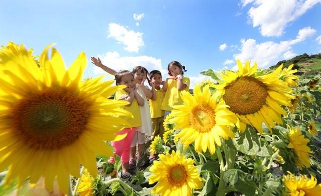 청명한 가을 날씨를 보인 5일 경남 함양군 함양읍 상림경관단지에서 나들이 나온 어린이집 아이들이 활짝 핀 해바라기를 감상하고 있다.