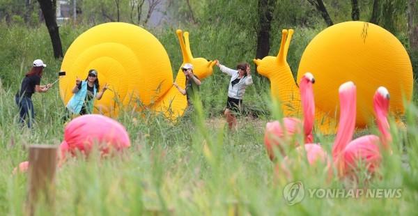 6일 오전 서울 이촌한강공원을 찾은 시민들이 달팽이와 홍학을 주제로 만든 작품 앞에서 기념촬영을 하고 있다. 서울시는 여의도·이촌 한강공원에 총 102억원을 들여 시민들이 앉거나 눕고 만져볼 수 있는 37개의 공공예술작품을 설치했다.