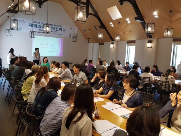 최근 서울 성동구는 강원 춘천시에 위치한 제이드가든에서 ‘성동 혁신교육지구 학부모분과 워크숍’을 진행했다. 사진은 워크숍에 참석한 학부모들이 ‘혁신교육 토론회’에 참석해 지역교육 현안 관련 이야기를 나누고 있는 모습. (사진제공=성동구청)