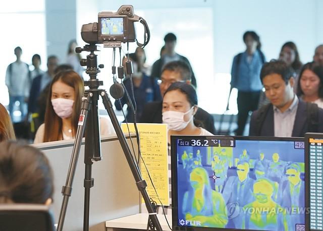 국내에서 3년 만에 중동호흡기증후군(메르스) 환자가 발생한 가운데 10일 오전 인천국제공항 제2터미널에서 입국객들이 체온을 측정하기 위한 열화상카메라 앞을 지나고 있다.