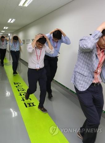 12일 오후 서울 송파구 롯데월드타워에서 2018 지진안전주간 민방위훈련과 연계해 열린 지진대피훈련에서 참가자들이 머리를 보호하며 신속하게 피난안전구역으로 대피하고 있다.