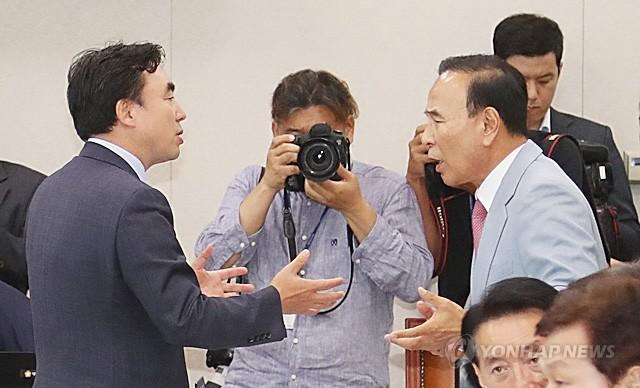 국회 국토교통위원회 소속 더불어민주당 신창현 의원의 택지 후보지 유출사건과 관련해 여야의 갈등이 격해지며 12일 오전 국회 국토교통위 전체회의가 지연 시작 및 정회로 난항을 겪고 있다. 회의가 정회된 후 더불어민주당 윤관석 간사(왼쪽)와 자유한국당 박덕흠 간사가 설전하고 있다.