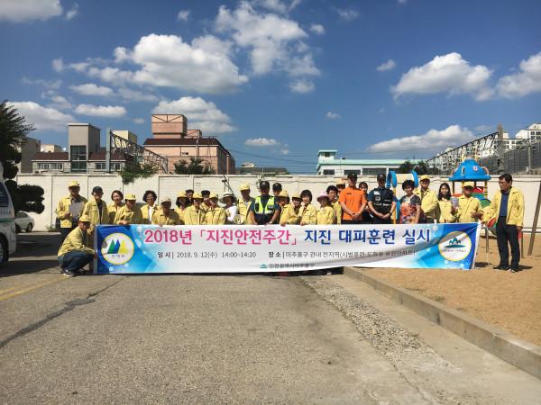 인천 미추홀구 도화1동 행정복지센터는 12일 동원아파트에서 지진대피훈련을 실시했다. 훈련은 남부소방서 주안119안전센터, 미추홀경찰서 주안역지구대 등 유관기관과 연계해 진행됐다. 사진은 참여자들이 기념촬영을 하는 모습. (사진제공=미추홀구청)