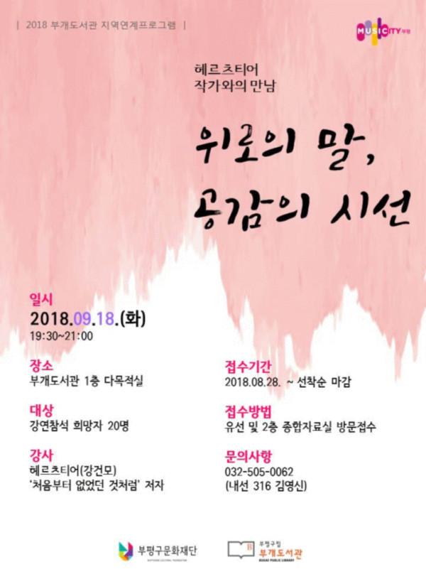 [인천=문찬식 기자] 인천 부평구는 오는 18일 오후 7시30분, 부평구립 부개도서관 다목적실에서 지역의 청소년과 성인을 대상으로 작가와의 만남 ‘위로의 말, 공감의 시선’ 행사를 개최한다.