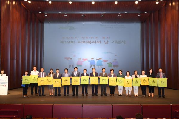 경기 구리시가 12일 구리아트홀에서 구리지역사회보장협의체와 구리시사회복지협회 주관으로 ‘제19회 사회복지의 날 기념행사’를 개최했다. 사진은 안승남 시장 등의 관계자들이 퍼포먼스에 참여한 모습. (사진제공=구리시청)
