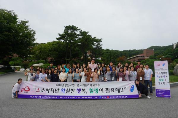 경기 용인시는 지난 11일 처인구 포곡읍에 위치한 대웅경영개발원에서 지역내 40곳 복지시설 및 공공기관의 사례관리사 50여명을 대상으로 ‘힐링 워크숍’을 진행했다. 사진은 관계자들이 워크숍 종료 후 기념촬영을 하는 모습. (사진제공=용인시청)