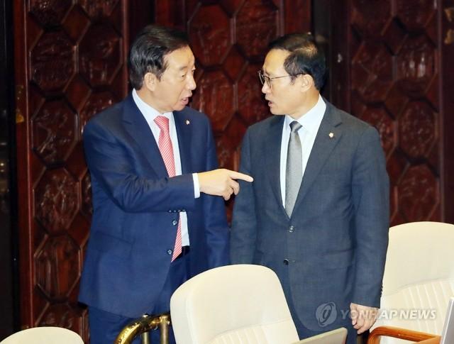 더불어민주당 홍영표(오른쪽), 자유한국당 김성태 원내대표가 13일 국회에서 열린 제364회국회(정기회) 제5차 본회의에서 대화하고 있다.
