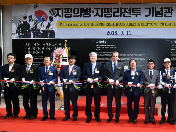 경기 양평군이 지난 11일 정동균 군수와 이정우 군의장을 비롯해, 정병국 국회의원, 바비앙 페논 주한 프랑스 대사, 조양호 한진그룹 회장 등이 참석한 가운데 지평의병 및 지평리전투기념관의 리뉴얼 기념 개관식을 개최했다. 사진은 관계자들이 테이프 커팅을 하는 모습. (사진제공=양평군청)