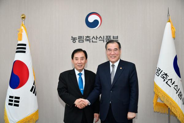 박윤국 경기 포천시장은 지난 12일 농림축산식품부를 방문해 이개호 장관을 접견하고, 농업분야 핵심사업 추진을 위한 국비지원을 요청했다. 사진은 박 시장(왼쪽)의 농림부 방문을 기념해 이 장관과 기념촬영을 하는 모습. (사진제공=포천시청)