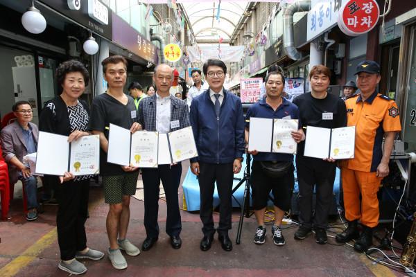 최근 정원오 서울 성동구청장은 지난 8월 금호동 금남시장 화재 발생시 진화에 직접 참여하거나 협조한 지역주민 5명을 유공자로 선정, 표장장을 수여했다. 사진은 표장장 수여 후 정 구청장(가운데)과 유공자들이 기념촬영을 하는 모습. (사진제공=성동구청)