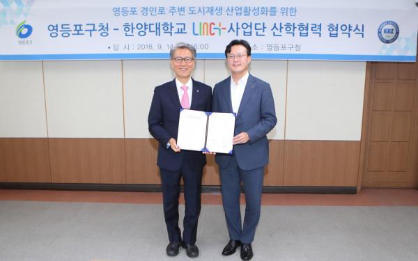 | ▲ 채현일 서울 영등포구청장(오른쪽)과 성태현 한양대학교 링크플러스(LINC+) 사업단장이 협약서를 들고 기념촬영을 하는 모습. (사진제공=영등포구청) | ||