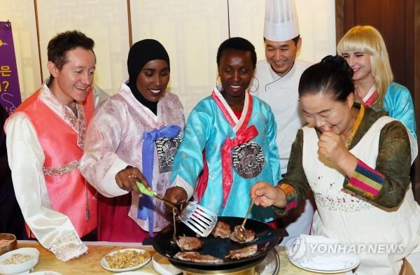 추석을 앞두고 17일 서울 중구 한국의집에서 한국문화재 재단 주최로 열린 '어서와 추석 애(愛) 한국의집은 처음이지'에서 외국인들이 허진 북한요리연구가와 함께 직접 전을 부쳐보며 즐거워하고 있다.