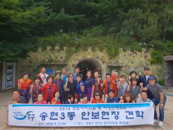 인천 동구 송현3동 행정복지센터가 지난 15일 주민자치위원회 주관으로 자생단체 회원 40여명이 참석한 가운데 ‘평화통일 기원 안보현장 견학’을 실시했다. 사진은 제4땅굴 앞에서 견학에 참석한 관계자들이 기념촬영을 하는 모습. (사진제공=인천 동구청)