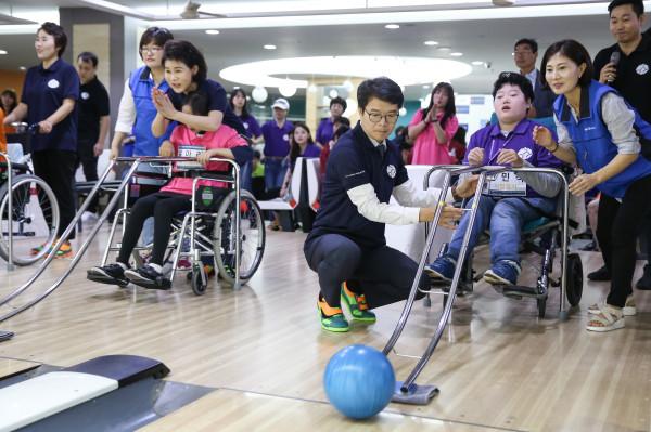 서울 성동구는 지난 14일 성수동 KB볼링센터에서 ‘제1회 서울시 발달장애인 어울림 볼링대회’를 개최했다. 사진은 정원오 성동구청장 박원순 서울시장 부인 강난희 여사 등이 참석한 가운데 대회가 진행되고 있는 모습. (사진제공=성동구청)