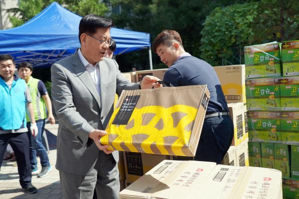 17일 서울 동대문구청 광장에서 ‘추석명절 희망나눔의 장’이 개최됐다. 이날 행사에서 삼육재단은 식료품세트 1350상자, 두유 1350상자 등 5000여만원 상당의 물품을 후원했다. 사진은 직원과 함께 나눔 물품을 나르고 있는 유덕열 구청장(왼쪽)의 모습. (사진제공=동대문구청)